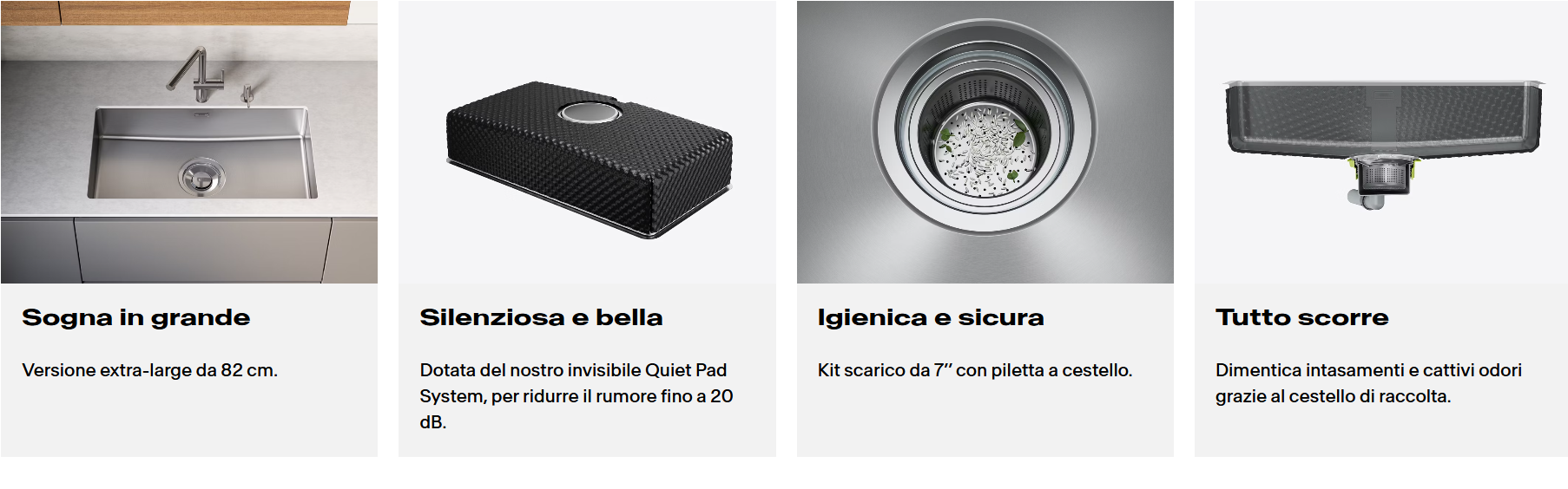 La vasca extra-large da 82 cm offre un ampio spazio di lavoro, ideale anche per teglie e pentole di grandi dimensioni, mentre le linee pulite e moderne si integrano perfettamente in qualsiasi ambiente cucina.